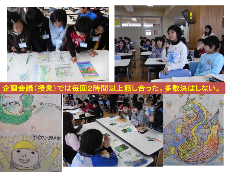 シンボルマークを作る時には、みんなで何度も話し合いました。そして「多数決はしない!」ということを決めました。多数決をしたら、そこで物語が終わってしまうからです。4年生70人が、それぞれいろんな意見をもっています。その意見がぶつかることもありましたが、その時には2つの意見をどちらもふくまれている新しい考え(アイデア)がうまれました。ひとつのマークができるまでたくさん話し合いました。最後に全員が満足するマークができました。このとき、子どもたちひとりひとりが物語の主人公になっていました。