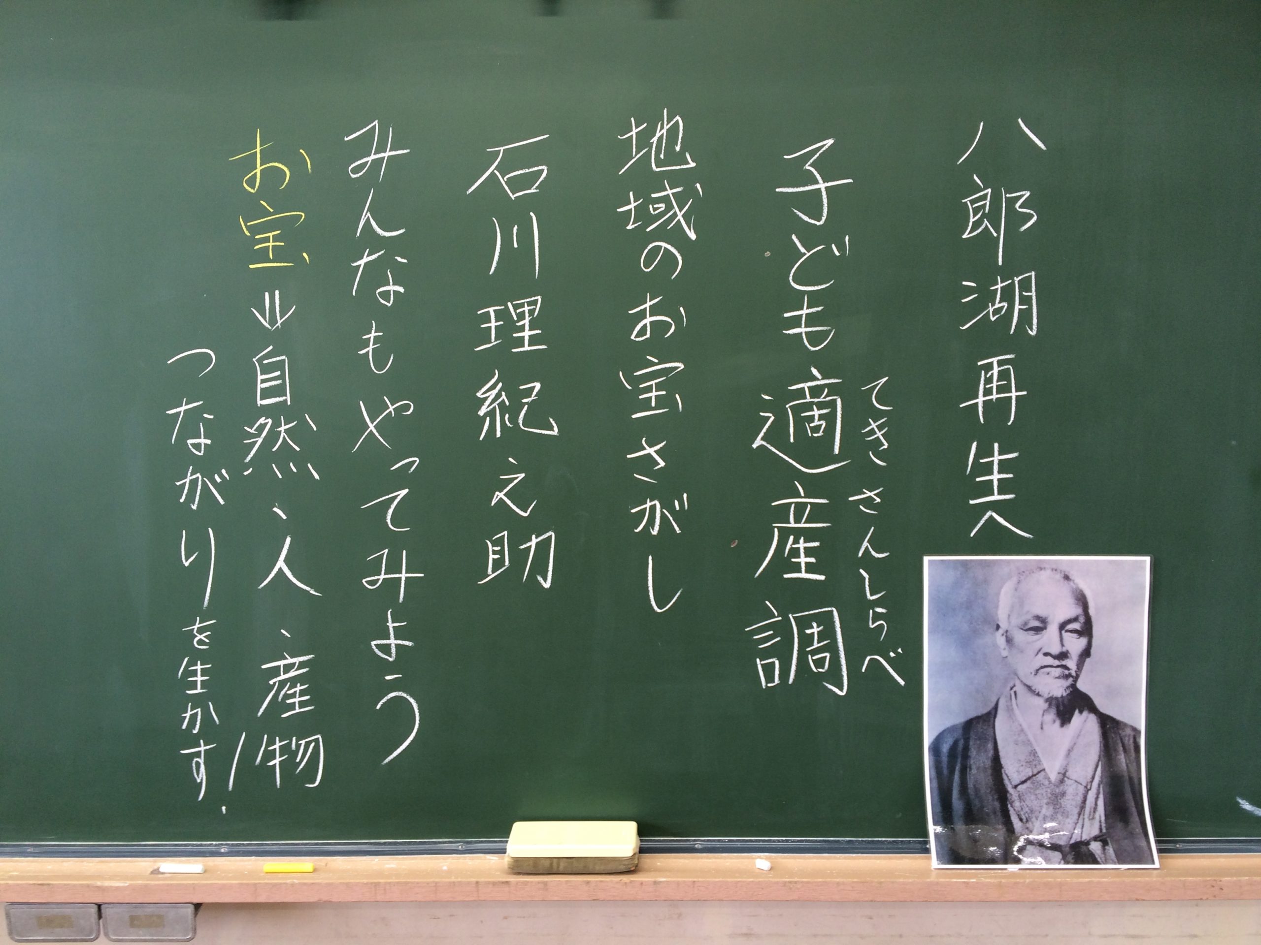 じつは子どもたちと同じことを考えていた人が、昔地元にいたのです。それは、八郎がたの近くで江戸時代から大正時代にかけて生きた、石川理紀之助(りきのすけ)という人でした。多くの人たちからそんけいされた人で、農業だけではなく自然や土地の歴史、人々のくらしなどさまざまな知識や知恵を持っている人でした。石川りきのすけは、特に秋田の貧しい村を救うために力をつくしました。村を救うためには、決まり事をたくさん作るのではなく、村人が自分の村の特色やいいところを学び、いいところをいかした特産品づくりや村づくりをしていくことが必要だと考えていました。そこで石川りきのすけは、『適産調べ(てきさんしらべ)』ということを行いました。適産調べとは、八郎がたのまわりを中心に、自分たちの村をすみずみまで調べて村のとくちょうやいいところを見つけ出し、それらのいいところをいかしてこれからの村をどうしていくのか、村の人たちと計画をたてていくものでした。