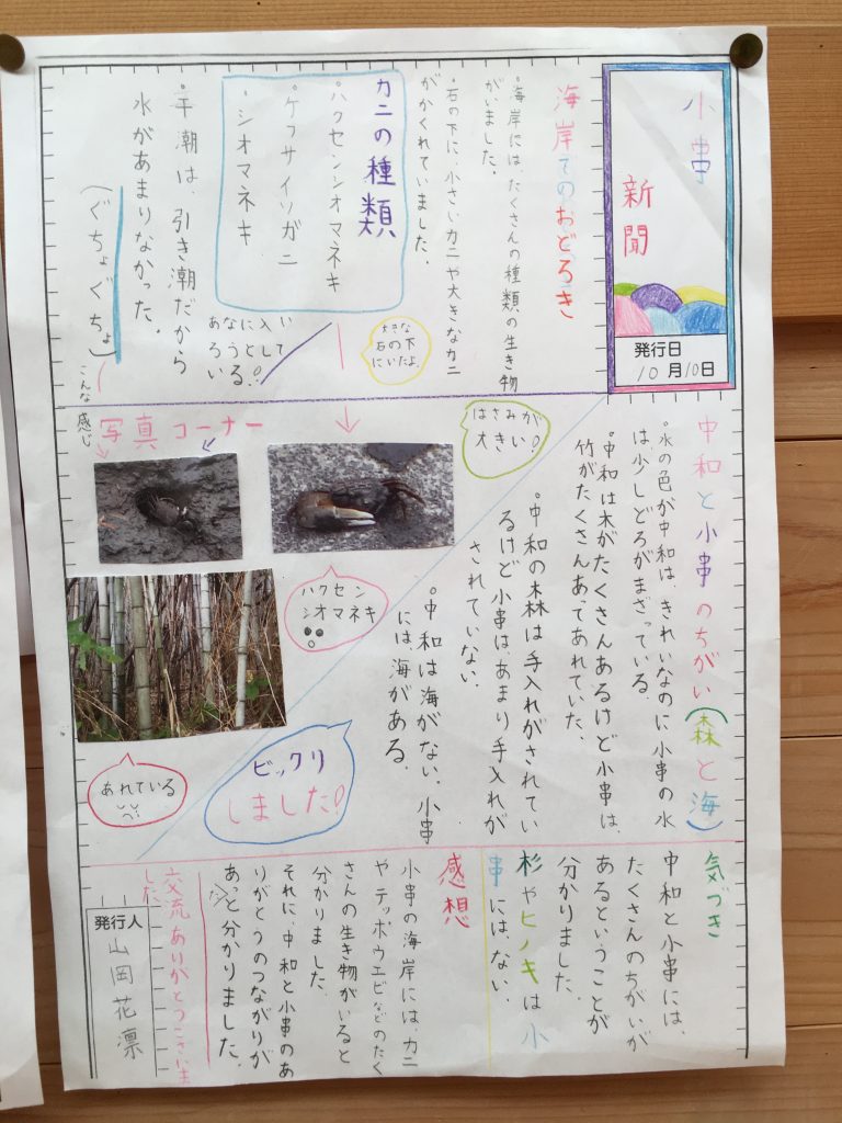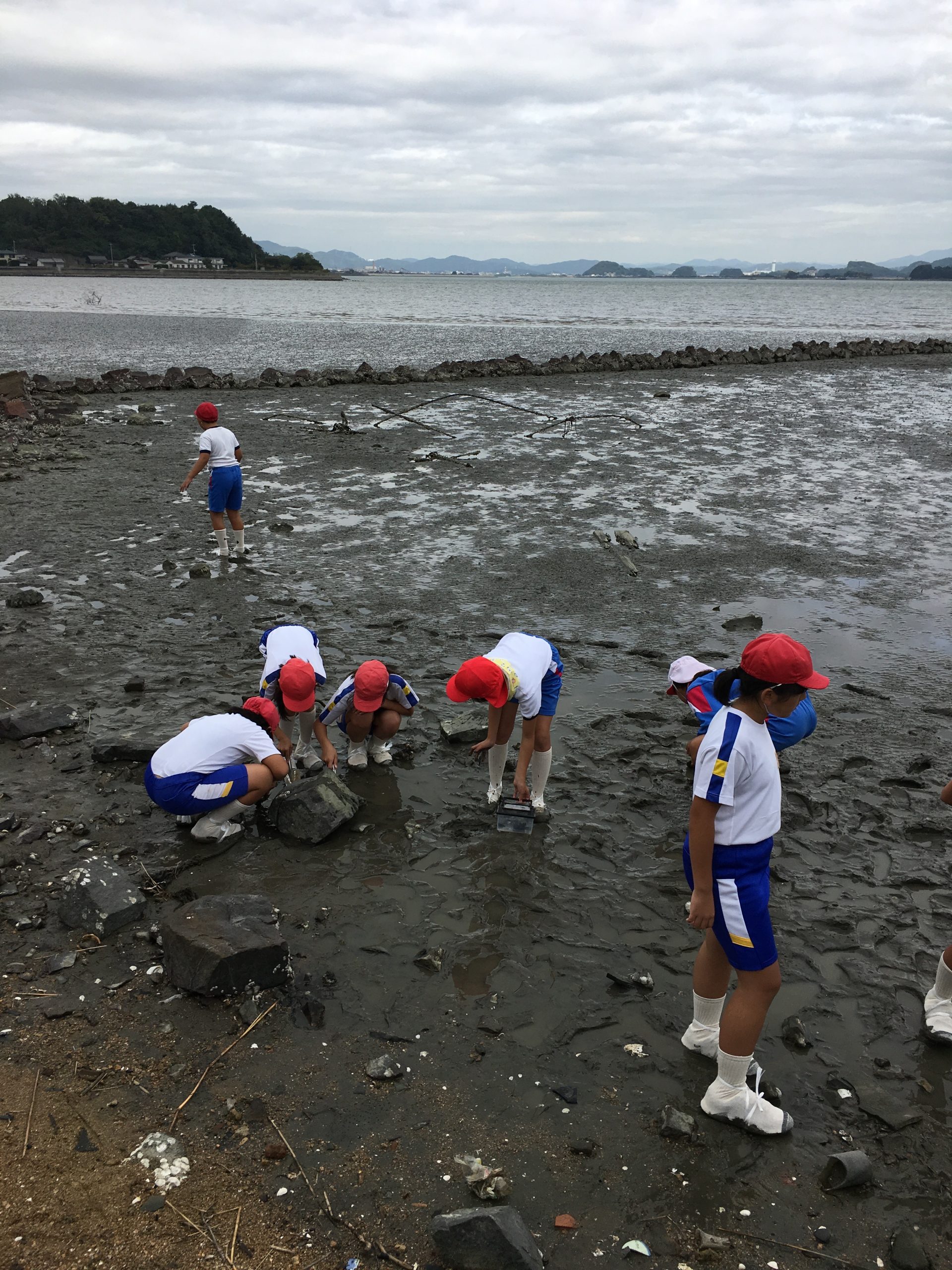 学校の近くにある干潟に行って、生き物を観察しました。かつては、多くいたハクセンシオマネキなどの生き物が減ってしまった原因を、それらの生き物を支える繋がりを通して考えました。