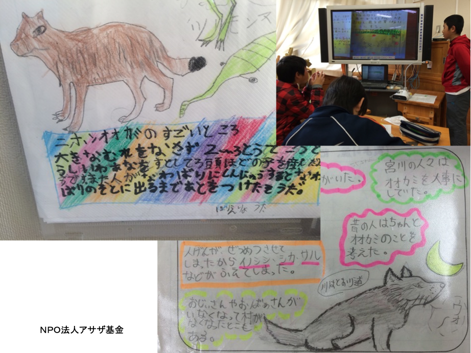 学習する中で、印象的だったのは、子ども達から何度も発せられた「害獣が増えたのは、日本オオカミがいなくなったから」という言葉でした。宮川の上流域は絶滅した日本オオカミが最後まで生き残っていた地域といわれています。そのため、地域には、今でも日本オオカミへの思いや記憶が生きていることが、子ども達との対話を通して見えてきました。そこで、地域の深刻な課題である獣害の対策を、オオカミと相談しなから考える学習を行うことにしました。オオカミとお話しする方法を学び、オオカミの目になって獣害問題を見つめ直すことで、駆除といった従来の獣害対策とは異なる発想が、子ども達から生まれてきました。詳しい内容は、学習事例集をご覧ください。(p6〜7)